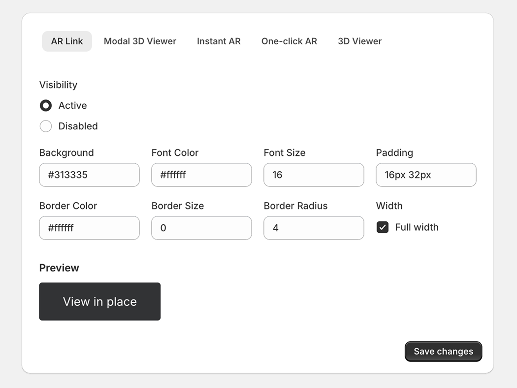 Use the settings panel to set your preferred button style, size, or color. As you make changes, you’ll see a live preview of the button below.For best results, design the button so it stands out and encourages shoppers to interact with it. Use clear call-to-action text such as “View in Place” or “View in Your Room”, and choose colors and sizing that make the button easy to notice.