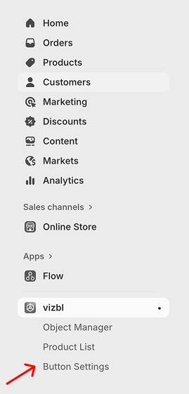 In your Shopify admin, select the VIZBL app from the left-hand menu. Then go to Button Settings.