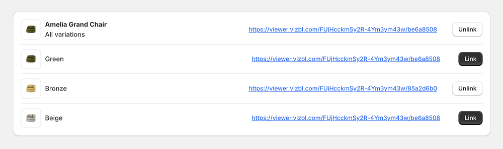 Your products are now linked to VIZBL 3D models. You’re ready to integrate them into your Shopify store and let shoppers explore your products interactively in 3D and AR.