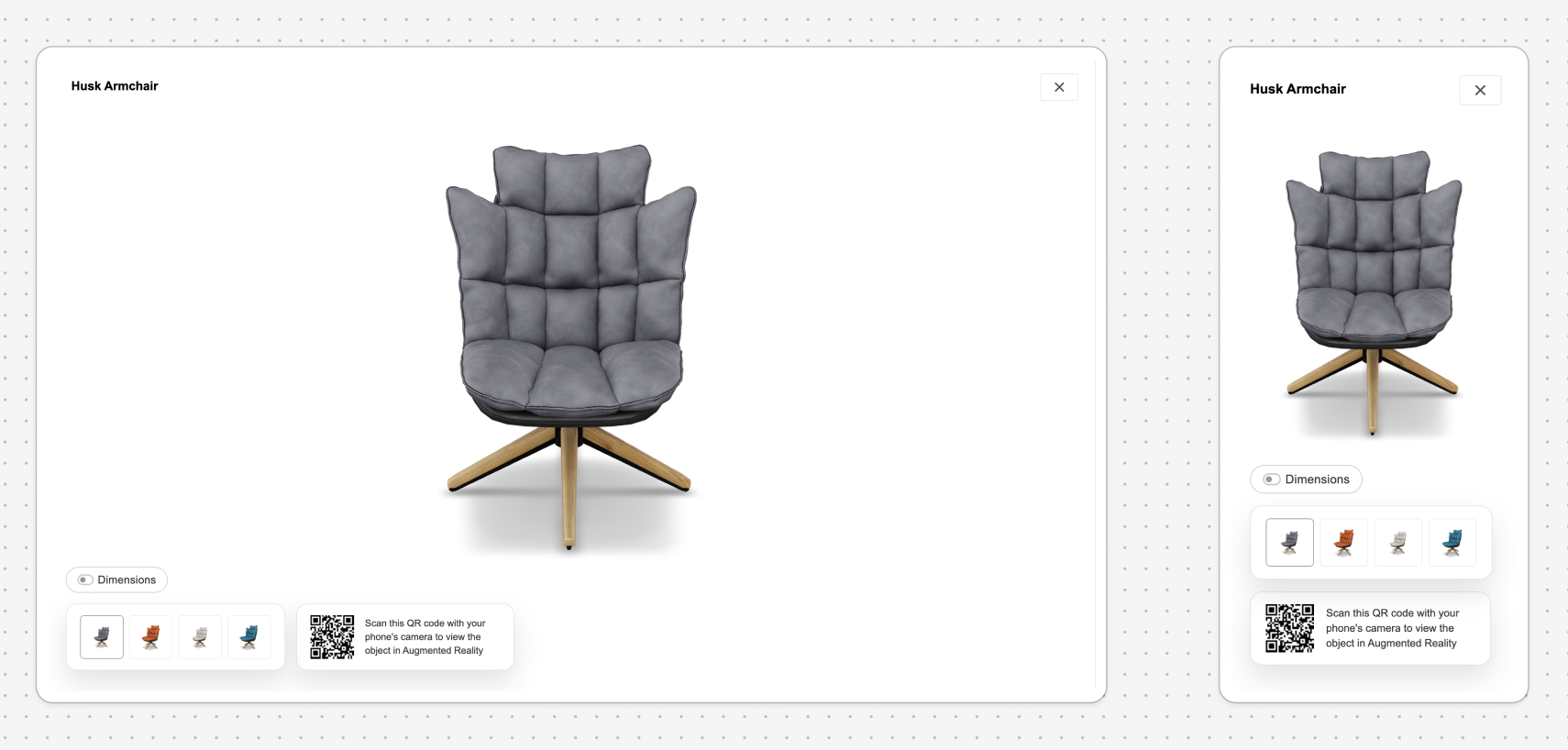 3D+AR Viewer displays an object 3D model in different color options. It also allows users to see the dimensions of the object and view it in their place using augmented reality. The viewer opens in a modal window on your website on top of the main page.