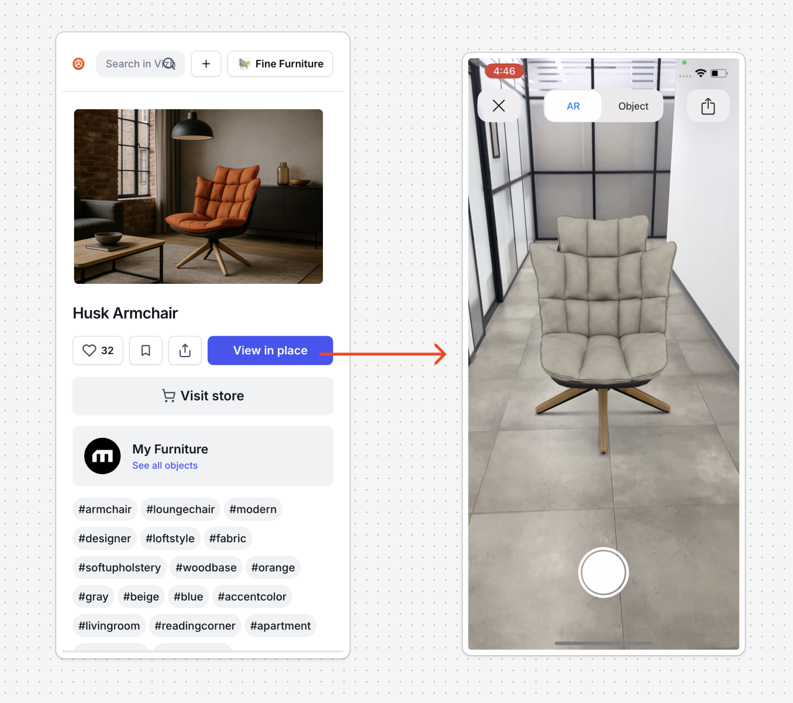 If the user opens the object card from a mobile device, the AR view launches immediately after clicking the View in place button.