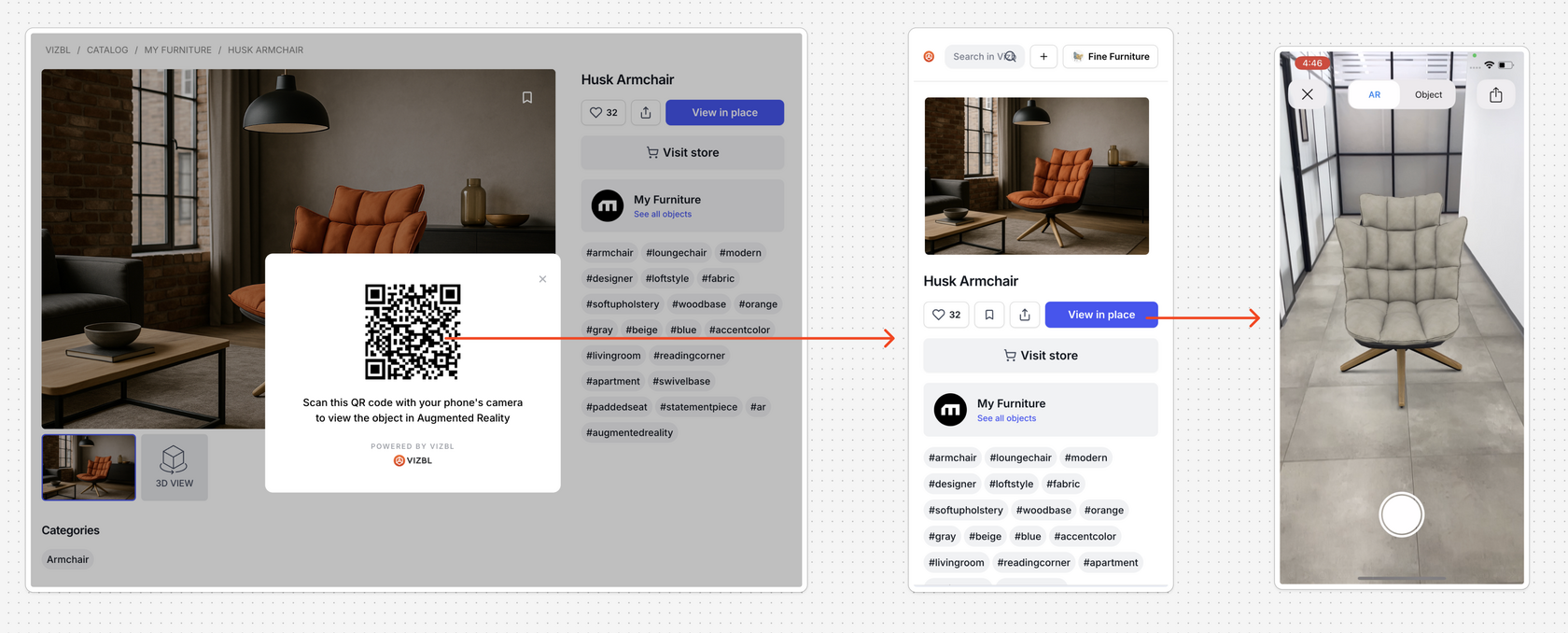 Basic AR Link redirects the user to the object card in the Vizbl catalog. From there, the user can launch the augmented reality view by clicking the View in place button. This is how the card looks on mobile and desktop devices: